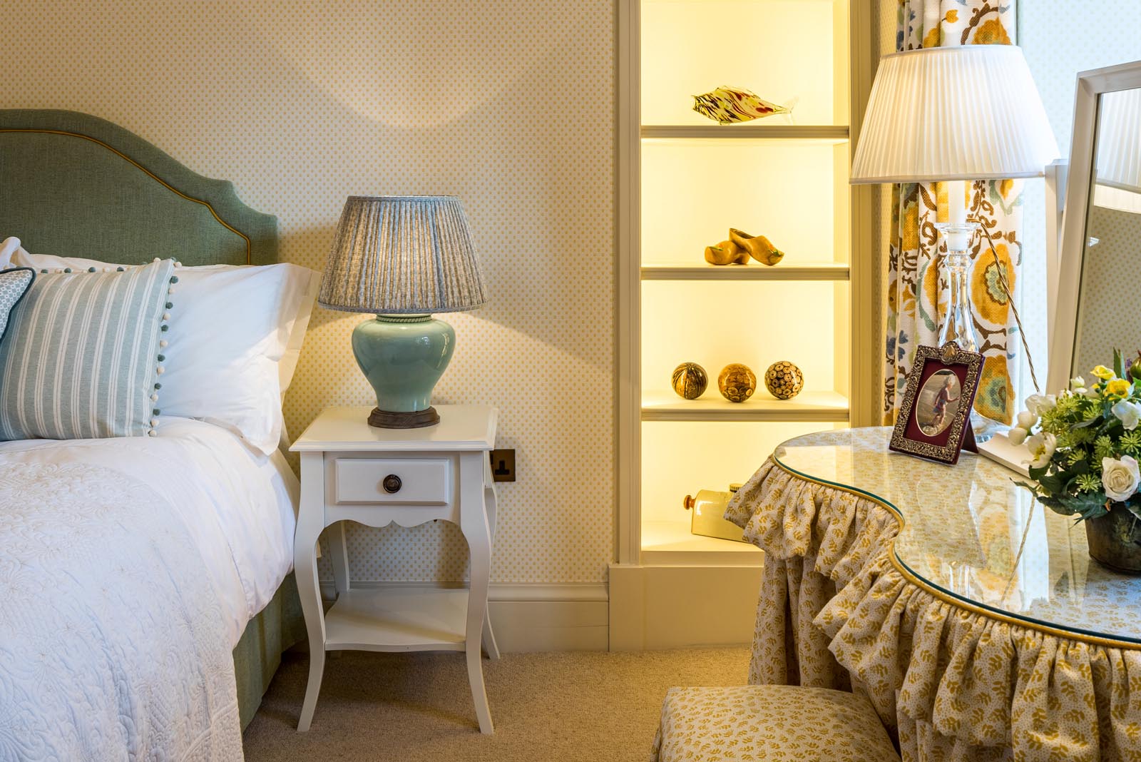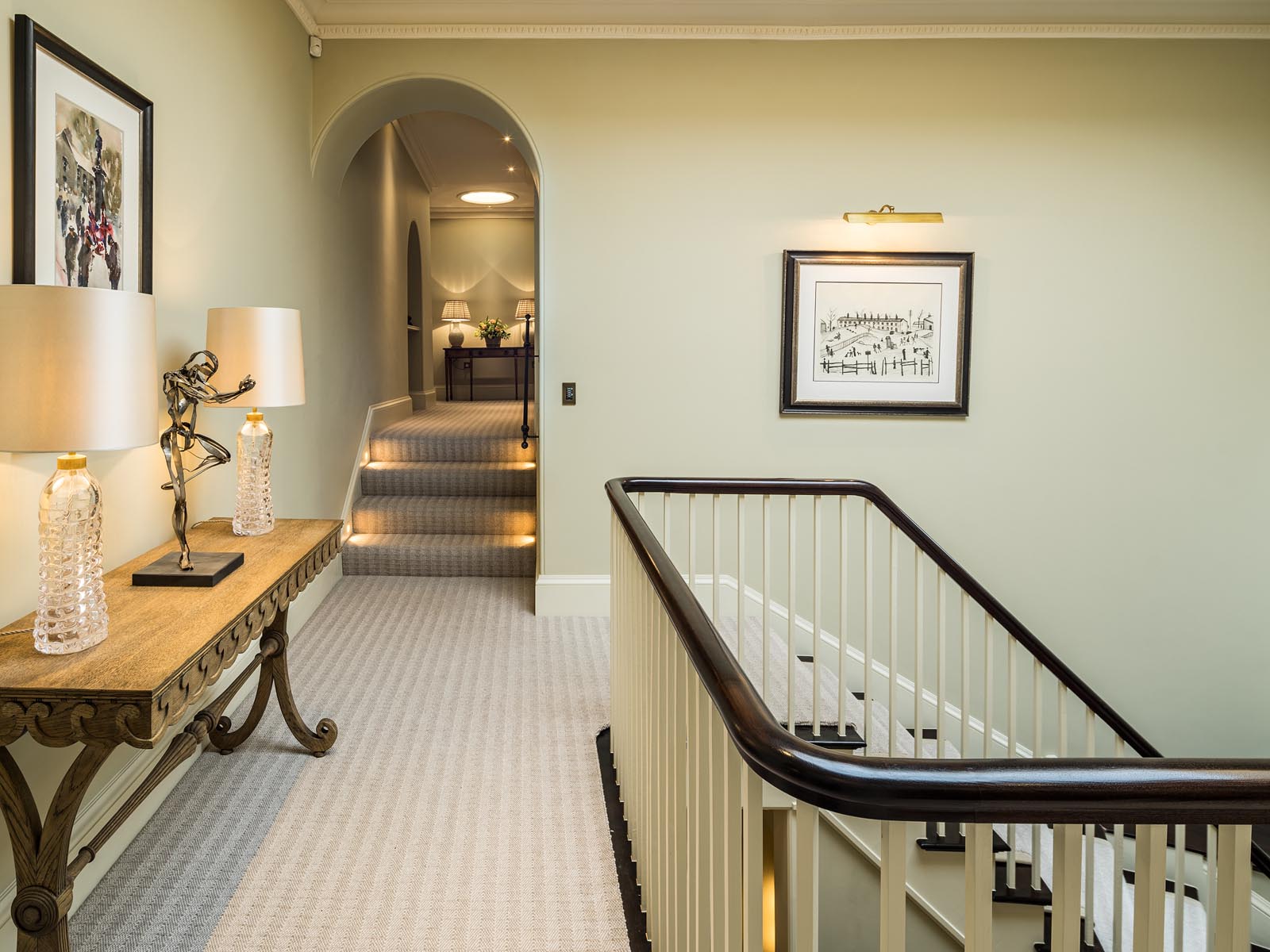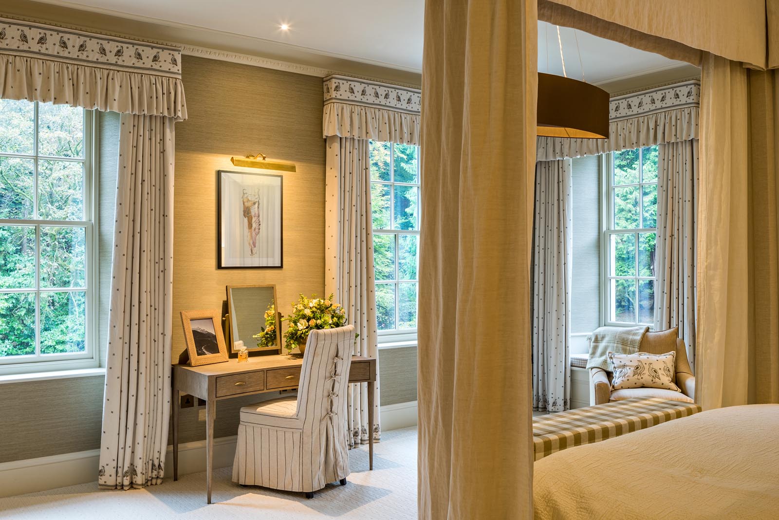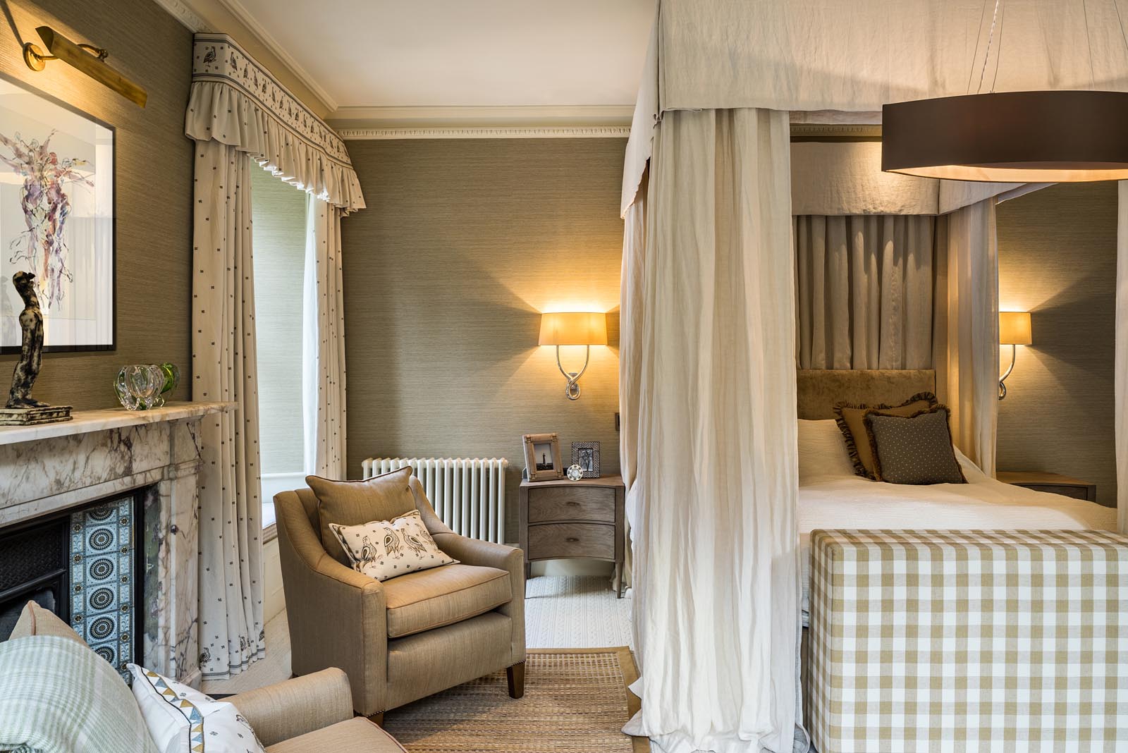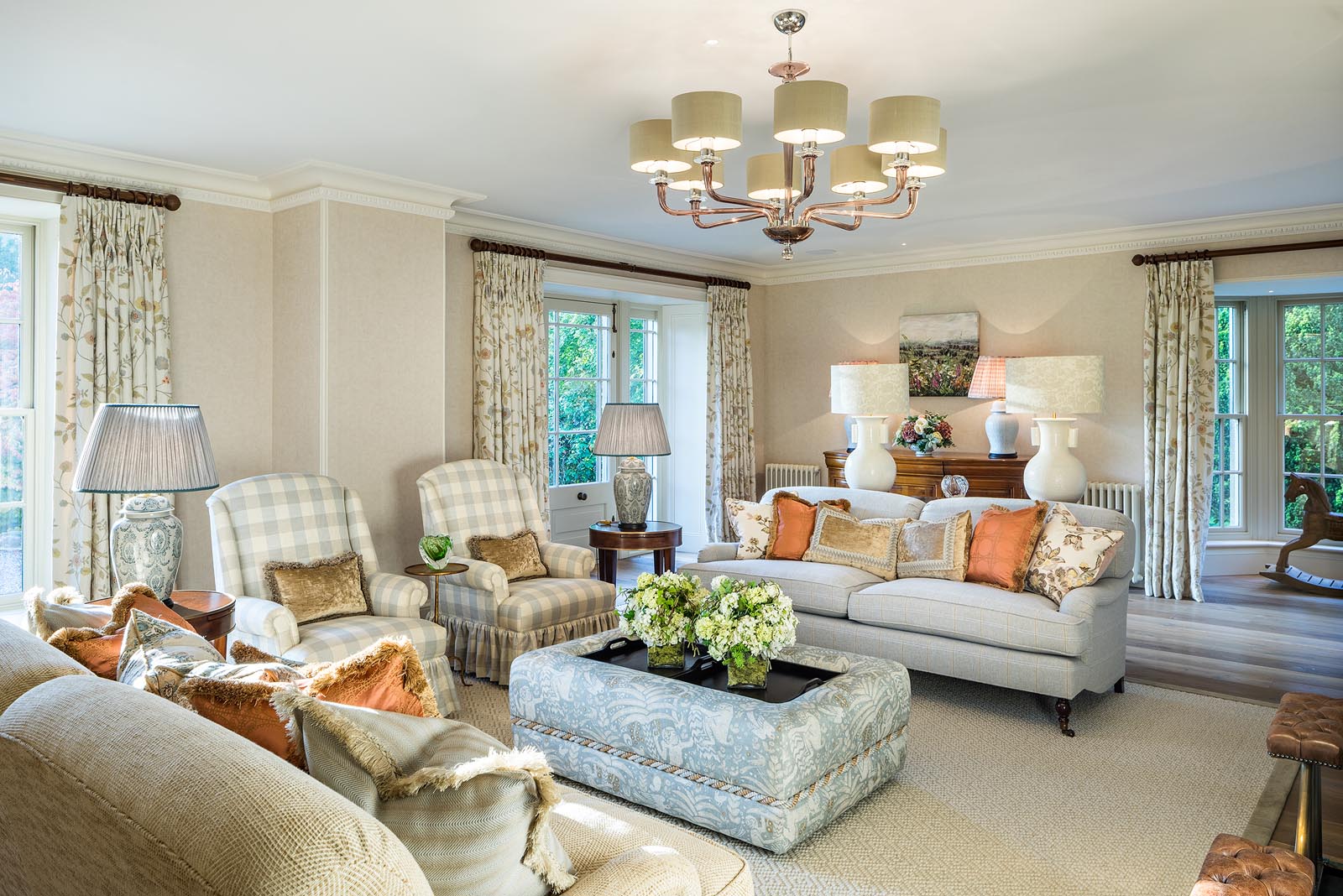 The design process was very much a joint effort with the client, who had her own exquisite style. Horton undertook the implementation of the interior schemes and soft furnishings throughout the property. This included bathroom design, joinery and lighting plans.